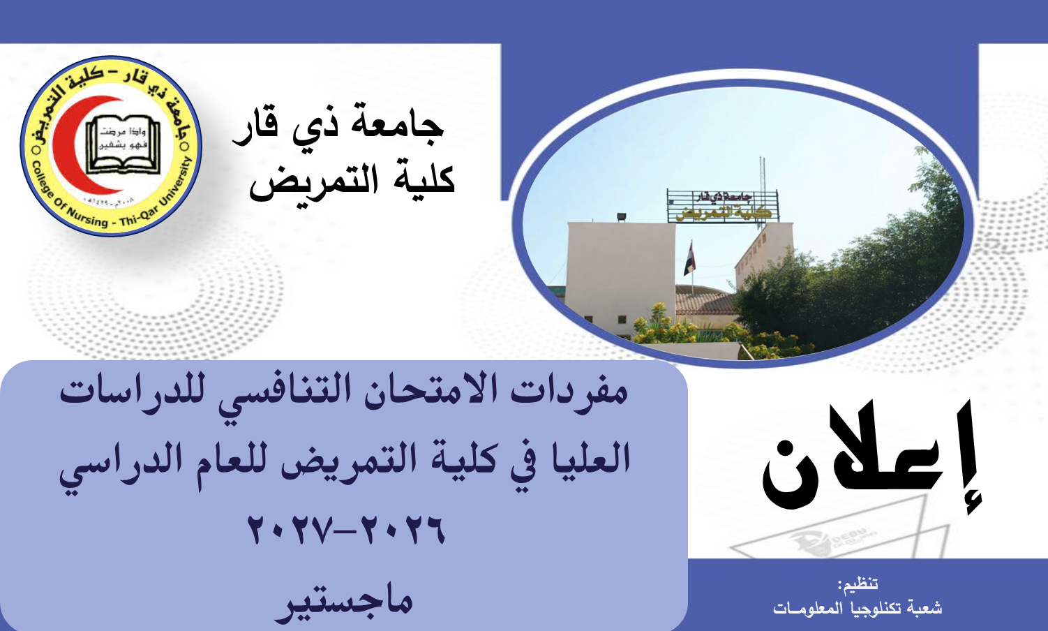 تعلن كلية التمريض في جامعة ذي قار عن نشر مفردات مناهج الدراسات العليا للعام الدراسي 2026-2027. لدراسة الماجستير في علوم التمريض